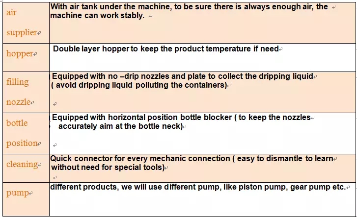 Бұл машина мотор майы, мотор майы, салат, қол жууға арналған гель, кокос майы, соя тұздығы, күнжіт, сусабын, сұйық сабын, қозғалтқыш майы сияқты тамақ өнеркәсібінде, химия өнеркәсібінде және тауарлық сұйықтықтың барлық түрлеріне арналған. , тежегіш майы, май, қызанақ соусы, сусын, эфир майы, өсімдік майы, бал, бұрыш тұздығы, жержаңғақ майы, йогурт, шырын, сусын және т.с.с. толтыру үшін поршеньдік сорғыны қабылдайды. Сорғының күйін реттеу арқылы ол барлық бөтелкелерді жылдам толтыру және дәлдікпен бір құю машинасына толтыра алады.
