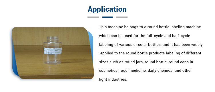 Бұл машина дөңгелек бөтелкелерді жапсыруға арналған машинаға тиесілі, оны әр түрлі дөңгелек бөтелкелерді толық циклді және жартылай циклдық таңбалау үшін қолдануға болады, және ол дөңгелек бөтелкелер, дөңгелек бөтелкелер сияқты әртүрлі мөлшердегі дөңгелек бөтелкеге арналған бұйымдарға кеңінен қолданылады. , косметика, тамақ, дәрі-дәрмек, күнделікті химия және басқа да жеңіл өнеркәсіптердегі дөңгелек банкалар. Жабдықтың құрамы: электр шкафы, тасымалдау механизмі, жеке бөтелке құрылғысы, роликті затбелгі құрылғысы, щетка жапсырмасы, 1 # затбелгі қозғалтқышы, жұмыс жүйесі және басқару жүйесі.